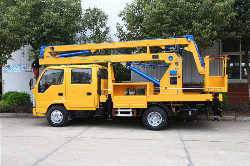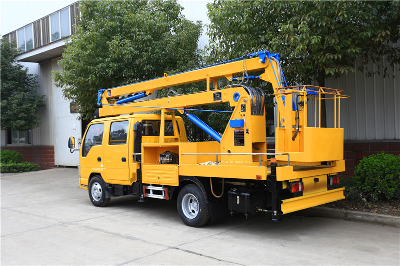 随底选装驾驶室。该车前伸为845mm。选装二节工作臂时,作业高度为12米; 选装三节工作臂时,作业高度为14米。防护材料:Q235A碳钢,连接方式:左右侧面及后下部防护均采用焊接连接,后部防护断面尺寸(mm):170×50,后部防护离地高度(mm):410。